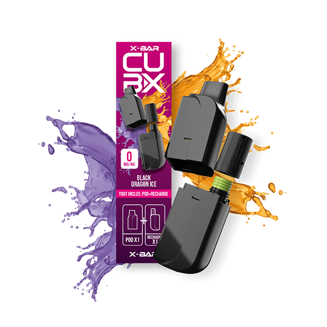 Lot de 2 pods pour X-Bar CUB-X : un pod de 2 ml + une recharge de 9 ml, saveur Black Dragon Ice.
